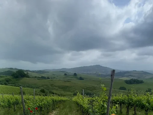 Po čase přišla i krize, že to snad nezvládnu. To jsme byli na okraji rušné silnice a prodírali se už nějaký čas křovím. Stačilo najít odpočívadlo (pro motoristy značené, ale značně neudržované), najíst se (uvařila jsem si další půlku rizota) a sehnat ubytování. Mám čerstvě menses a tak mimo plán bydlíme v poutnickém Affittacamere Pellegrinaio del Poggio v Torrenieri. Najednou jsem 10 km zvládla pod 2 hodiny, kopce nekopce! 😁 Krásné výhledy, mraky a mírný déšť byly příjemným zpestřením. Umytá s namasírovanýma nohama ležím na posteli a už se mi klíží oči 😊 Jsme na 4-lůžkovém pokoji jen 3 (my dva a Američan z Texasu), je tu čisto, milo, i fén tu mají a cena 18 eur je prima. To péro v matraci, co mě původně tlačilo v sedě do zadku, v leže necítím a tak se mi leží příjemně.