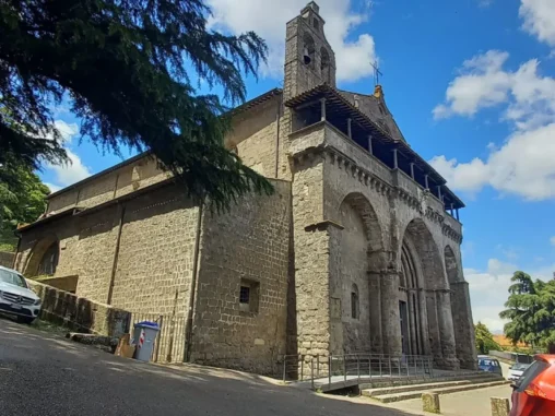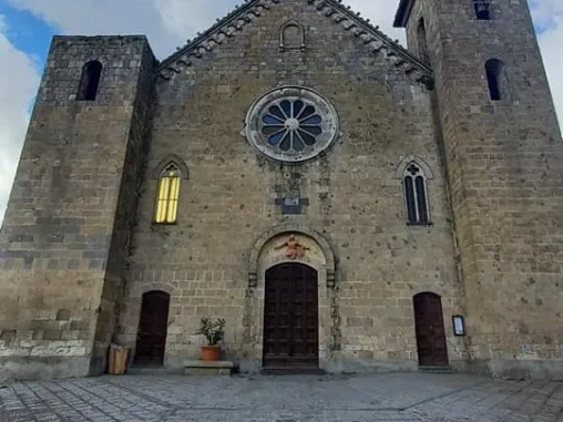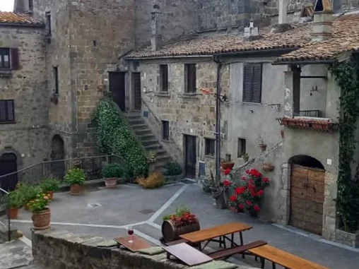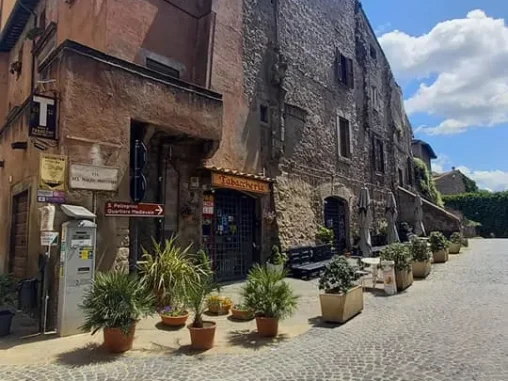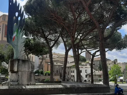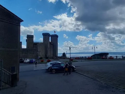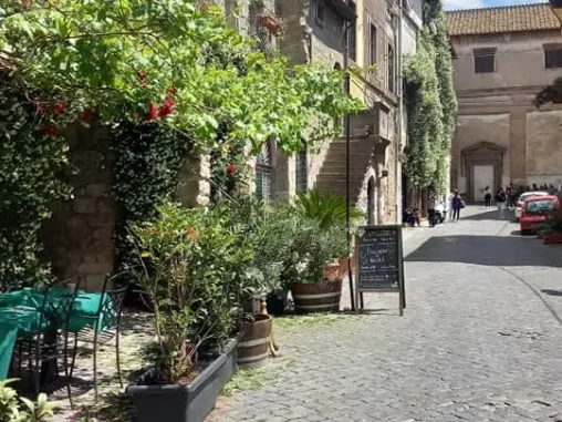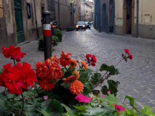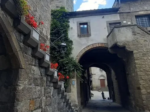 Tady jsme měli vyhlídlý autobus (o něco si zkrátit cestu, abychom stihli do Říma dojít) a 3 hodiny času, tak jsme prošli krásné historické centrum a v informačním centru naproti krásnému kostelu, který jsme si jako mnoho dalších prohlédli i uvnitř, jsem viděla, že v nějaké restauraci mají menu pro poutníky (4-chodové za speciální cenu), tak jsme se tam vydali. Bylo to na druhém kraji města, nevypadalo to zle, ale nejdřív nám servírka nedovolila si sednout venku a pak ani u stolu, kde už jsme se skládali, že prý pro dva je prostřený jiný (taky se 4 místy, jako ten, kam jsme si už sedali). A tak jsme si uvědomili, že vlastně o žádné menu nestojíme (oba jsme měli jen chuť na pizzu) a šli pryč. Po chvíli procházení zpět krásným historickým centrem jsme si dali něco přímo na náměstíčku (já si omylem nalila bublinkovou pomerančovou limonádu do kafe – nedoporučuji) a maličko sprchlo, tak jsme byli rádi, že jsme pod stříškou restaurace. Pak jsme se šli podívat za hradby a začal slejvák i s bouřkou, naštěstí tam byly nějaké divadelní kulisy a nepršelo na nás, tak jsem poobědvala ze svých zásob.