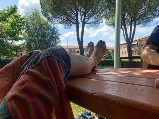 Po asi 4 km nás cesta konečně zavedla do přírodní rezervace, kde jsme po chvíli našli odpočinkové místo se stolem a lavicí, druhá lavice byla rozbitá, no celkově to byla velká džungle a na to, že je to poslední etapa Via Francigeny, velmi neudržované. Lidé se tu prodírají s klackama. Michal si řekl o pauzu, poprvé v historii, co ho znám! Ráda jsem se zastavila, uvařila si ajurvédskou kávu a vyfasovala croissant od Michala, dali jsme si sušenky a jiné dobroty. A zahrála jsem na brumli, což byla velmi vtipná vsuvka (zaznamenána ZDE na videu, stojí za to na něj mrknout). Zjistila jsem, že už je mi mnohem lépe a že prostě do toho Říma dojdu! 🙏🏻😍