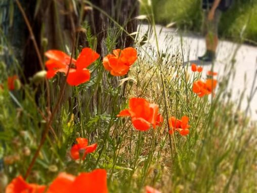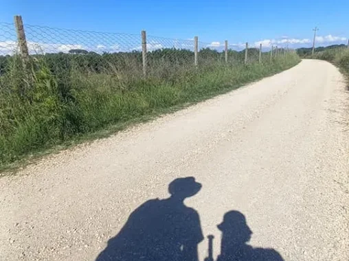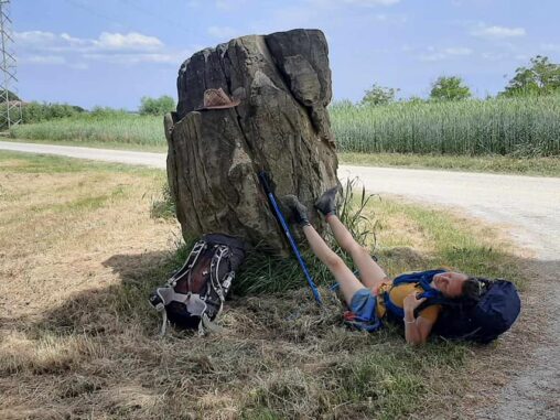 Hned kousek byla restaurace, kde jsem poprosila o vodu, co mi docházela. A za chvíli jsem došla Michala, vycházel ze křoví zrovna ve chvíli, kdy jsem nadávala, že proč mám jít doprava, když značka Řím je sakra doleva 😁 Tak jsme zase putovali spolu, pomalu, moc to nešlo, kolem za plotem sady, stínu bylo opět málo a když se vyskytl, zastavovali jsme se tam a já jsem cítila, že něco je jinak, než že bych se takto cítila „jen“ z únavy nohou a materiálu.
