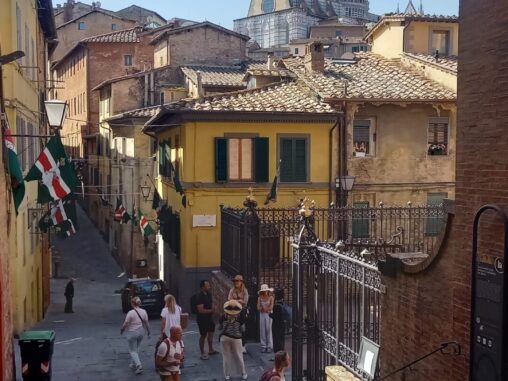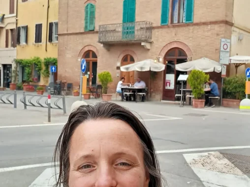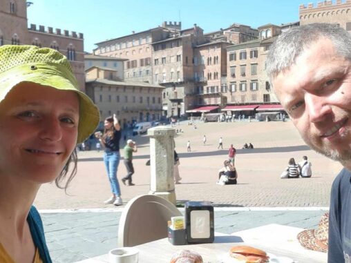 Pak jsme si zajistili bus z okraje města do Sieny, odkud nám zítra začíná poutní cesta do Říma 🤍❤️ A šli městem v klidu, s posezením na břehu řeky na svačinu, až na stanici tramvaje, která nás dovezla na autobusové nádraží. Už se nám dost vybily mobily a marně jsme v místním baru s obchůdkem hledali místo, kde je dobít. A pak jsme čekali a čekali … naštěstí přišla zpráva, že má bus zpoždění (40 min), jinak bychom už byli nervózní, že jsme ho přehlédli v bezpočtu dalších autobusů, které podle nás zastavovaly bez ladu a skladu. Přijel se zpožděním necelou hodinu a i 1 čekající Ital říkal „To víte, Italové“ 😁