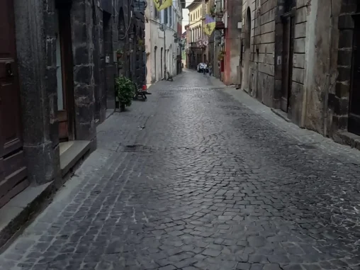 Po čase jsme se vydali ještě výš na Papežův hrad, kde byl i nádherný park, ale hlavně jsme byli úplně na špici kopce s výhledem na všechny strany – na jedné straně jezero a na druhé straně taky nádherná krajina, to bylo opět fascinující 😍 Cestou dolů jsme narazil ještě na další kostel, vevnitř hledali jako vždycky razítko, nenašli, ale našla jsem ještě jedny otevřené dveře, které vedly do stacionáře. A tam seděl milý boží služebník a razítko nám dal, jupí! A je na něm 100, protože z Montefiescone je to 100 km do Říma! Pak jsme ještě potkali 2 poutníky, které jsem předešla dopoledne a ti nás poslali do jedné nádherné katedrály – jak zvenku, tak zevnitř, tak tam jsme si ještě zašli pěknými úzkými uličkami, které náš dojem z městečka vylepšili.