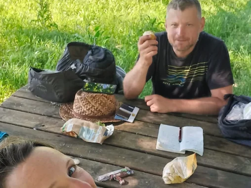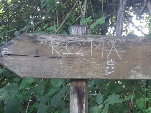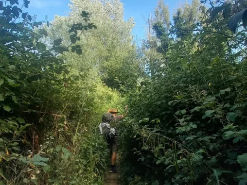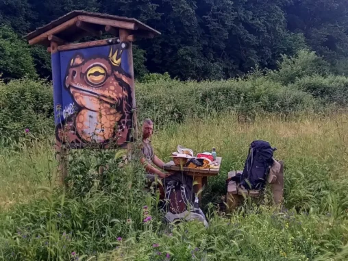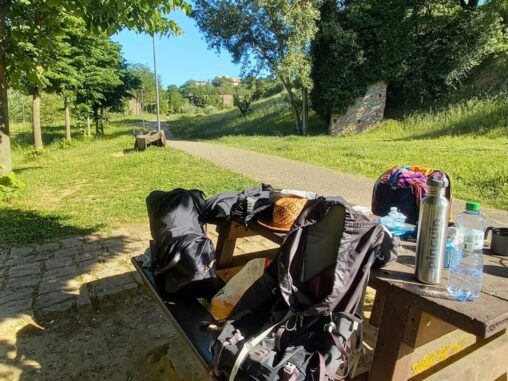 Potom jsme šli ještě asi 4 km přírodní rezervací, no spíš jsme se prodírali džunglí (velice zajímavé, když už jsme byli v Římě), taky se dost nasmáli (11 km před cílem je to prostě už veselejší), i když sem tam to dost bolelo od trnů a kopřiv. Až jsme došli na okraj rezervace, kde chceme přenocovat. Nejdřív šel Michal ještě asi 800 m do města pro vodu, protože nám už docházela a pak jsme se vrátili k lavičkám se stolem „u krále žabáka“, tady povečeřeli a já si vyležela a protrhala místo, abych postavila stan. Už stojí a my si říkáme, jak zvláštní pocit, že už nám to zítra končí…