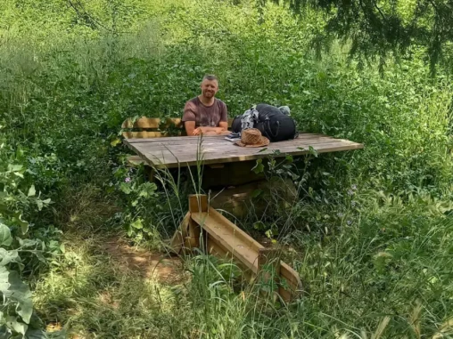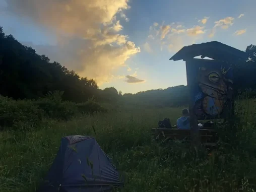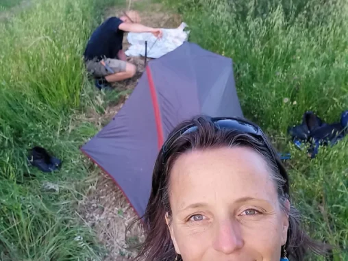 Opět jsem vysílala s otevřeným srdcem přání do vesmíru, ať se v něm dá koupat a taky jsem si přála klidné, rovné a hezké místo s vodou na přenocování. No a když jsme došli k jezeru, věděli jsme, že odsud se dnes už nehneme! 😍 To raději vstaneme o hodinu dřív, abychom dřív vyrazili a víc ušli. Opravdu nádherné místo s lavičkami, pitnou vodou, skvělou atmosférou 🙏🏻 Bohužel dno jezera je tak bahnité, že jsem se zabořila málem až po kolena, takže jsem pokusy o plavání vzdala a sebe, i vlasy, umyla v pitné tekoucí vodě. A vyprala, zase chvilku nebudu tolik zapáchat! 😁 Potom jsme našli místo, kde jsem postavila stan a Michal rozbalil tyvek a teď už čekáme, až se nám bude chtít spát.