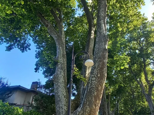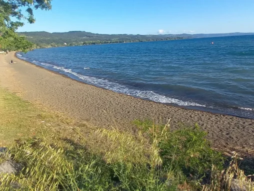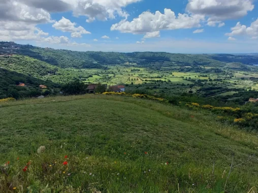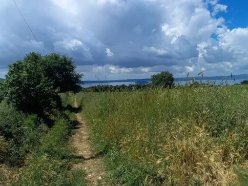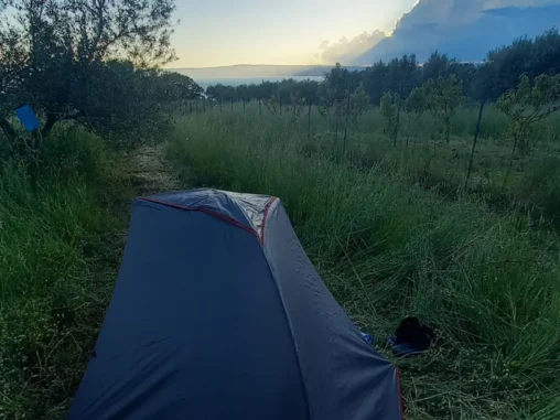 Pak jsme vyrazili podél jezera za město hledat místo na spaní. Po pár kilometrech, kdy už jsme od jezera vyšli na kopec nad ním, jsem viděla prostor, kde končily domy se zahradami, který má částečně pokosenou trávu mezi olivami a bylo jasno. Takže tady nahoře, nad jezerem, s výhledem na něj, dneska nocujeme. Uvidíme, jaká bude noc, má trošku sprchnout, takže i Michal si zhotovil přístřešek (já s chutí po 2 dnech postavila stan). Věřím, že to bude fajn 🙏🏻