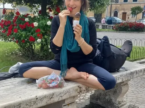 U té vody jsme chvíli pobyli (na parkovišti), já jsem si uvařila oběd (čočkový dhal), Michal si dal nějaké jídlo ze svých zásob. Pak jsme popošli dál, tam jsme si oba dali 2 kopečky zmrzliny, zase vynikající 🤩 Vlastně už jsme pochodovali okrajem Říma, bohužel tahle cesta vedla hodně podél silnice, takže součástí byl hluk a pach z výfukových plynů. Ale taky obchoďák, kde jsme doplnili dobroty, hlavně Bastoncino alle olivo, to je úplně nejvíc super pečivo s olivami (takové silnější měkké tyčinky). A croissanty, ovoce.