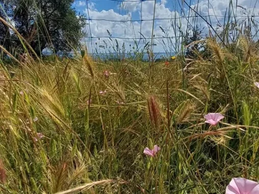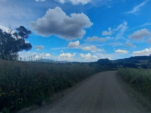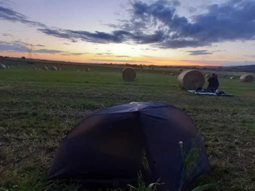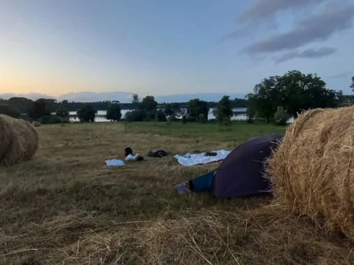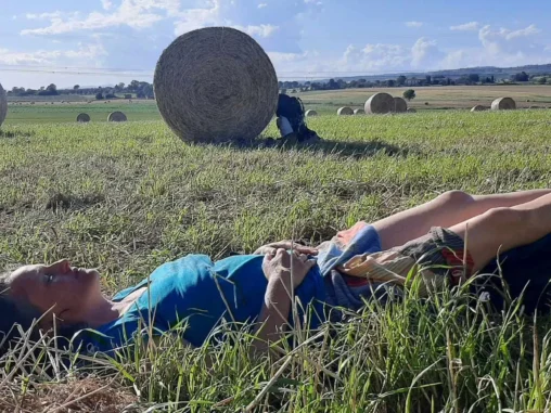 Jelikož město Vitarbo, které je konečnou stanicí další etapy, je velké město a do něj jsme dojít nechtěli, tušili jsme, že bychom tam nemohli v klidu spát venku, začali jsme hledat místo na nocování. Našli jsme pole s balíky sena u olivového háje, který nás odděluje od toho velkého města, takže ho nevidíme ani neslyšíme ☺️ A kocháme se výhledem do překrásné krajiny. Sluníčko svítí, na nebi plují krásné mráčky a my už dneska nikam nemusíme! Uvařila jsem si k večeři kus-kus se zeleninou a nečekaně v něm byly i rozinky! Ale mně to chutnalo. Michal má koupený ananas, o který se podělil a tak jsme si tady příjemně hodovali a teď čekáme na impuls, abychom si postavili něco na přespání, což znamená, že Michal si lehne někam na zem na tyvek a já si budu stavět stan.