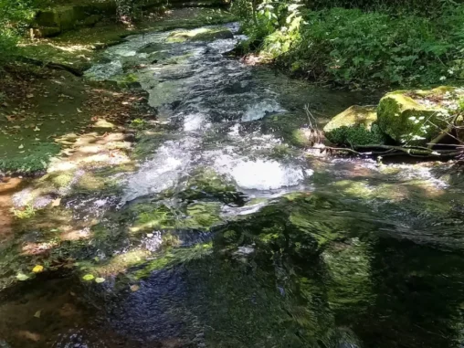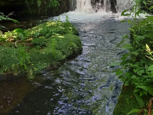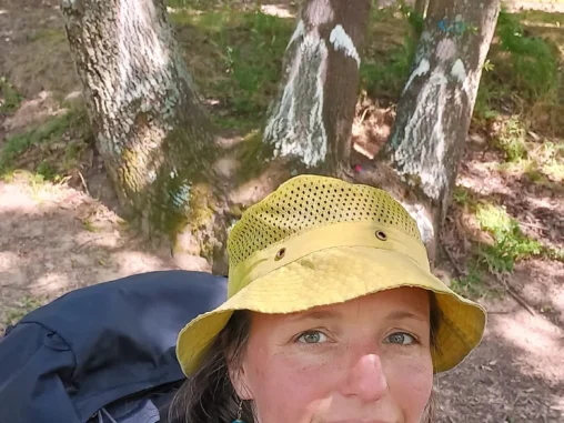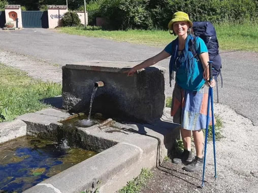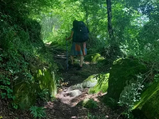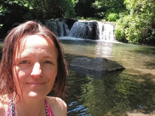 Brzy jsem došla k vodopádům a připadala si najednou jako v ráji – voda, stín, nadhera 😍 Na odchodu odtud byli 2 američtí poutníci a ti mě přesvědčovali, ať si ve vodě namočím nohy, že to je moc příjemné. To opravdu nemuseli, shodila jsem krosnu, převlékla se do plavek a našla místo, kde se dobře lezlo do tůně pod vodopády. A za chvíli jsem tam byla, i když jsem rozvířila spoustu bahna na dně, zaplavala jsem si a osvěžila se. Pak jsem se vyhřívala na sluníčku, vyprala jsem si další tričko (druhé ze dvou) a vůbec se mi nechtělo dál. Po čase jsem se vybičovala a všechno sbalila, mokré věci dala na batoh, aby cestou schly a vydala jsem se dál.