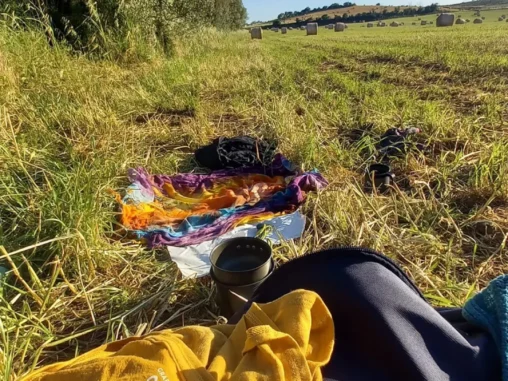 Dnešní noc byla z těch náročnějších – louka plná hmyzu a ač jsem ložnici stanu zavřela hned, jak jsem tam něco dala, ač jsem se večer umyla (dokonce ohřátou vodou, když jdu zítra mezil lidi), hmyz si ke mě po spacáku cestu našel, nebo aspoň to tak vypadalo, drbala jsem se o sto šest. A taky hledala polohu s co nejméně bolestmi. Ráno jsem vylezla dřív než Michal, který taky nemohl moc spát a v noci se přesunul z lavice na zem. Dala jsem sušit stan, udělala si kaši a čaj, provedla očistu, pomalu jsme posnídali a začali balit. Za tu dobu kolem prošly 3 party poutníků, známé od vidění, 2 italky se u nás zastavily a daly do řeči. První jen poslední dva dny doprovází kamarádku, která už jde 12. den, vyrazila ze Sieny, jako my, jen měla víc času a tak si dala i úseky, co my popojeli. Prý jsme udělali dobře, že jsme na popojetí zvolili Radiocofani, prudší a táhlejší stoupání (9 km) nezažila ani na pouti do Santiaga, ani v Himalájích. Zpětně jsme poděkovali bouřlivému počasí, že nás k tomu navedlo 🙏🏻☺️