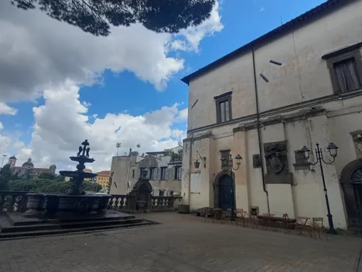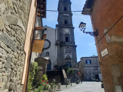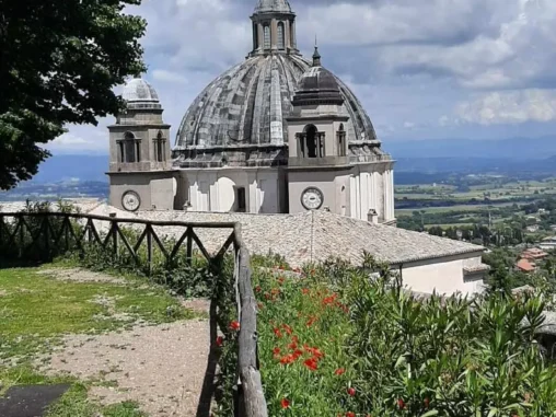 Hodně překvapující bylo, když jsem vyšla posilněná svačinou slušný kopec a najednou se přede mnou otevřel výhled na nádherné Montefiescone s úžasnou kopulí katedrály Sv. Magdaleny na velkém kopci na jedné straně a jezerem na druhé. Ten pohled byl tak boží, že jsem nahlas vykřikla „A do prdele“, tahle cesta odkrývá tolik nádherných míst! Než jsem se prodrala městem k Michalovi, který mě čekal u fontány, navštívila jsem 2 kostely a koupila si focacciu a pečivo, protože mi bylo jasné, že všude bude zavřeno. Trvalo by to asi hodinu. Michala jsem u fontány našla, u uzavřeného informačního centra, takže jsme řešili, kde bychom dostali razítko, už včera jsme vyrazítko nezískali v Bolseně, bylo taky zavřeno. A správný poutník potřebuje razítka ve svém Credencialu! Sedli jsme si do kavárny na náměstí, kde něco opravovali a byl tam hluk a ani ono samo o sobě nebylo tak pěkné, což nás překvapovalo, nebyli jsme na to zvyklí. Já jsem si dala kafe, zmrzlinu a nabíjet mobil.