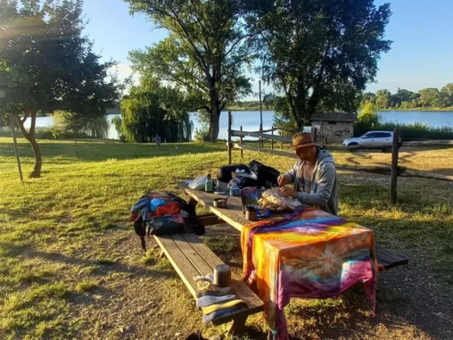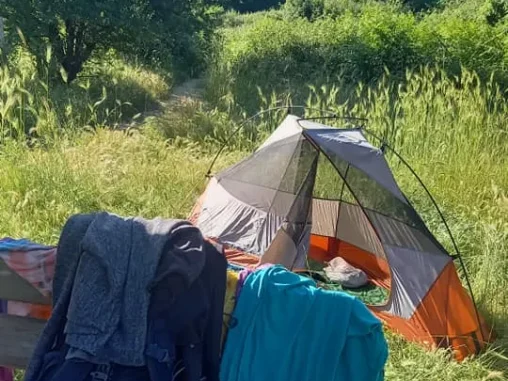 Noc byla v rámci možností celkem v pohodě. Ve stanu jsem se trochu budila, šoupala jako píďalka a při noční procházce na toaletu se kochala krásným nebem a měsícem – ani nebyla tma tmoucí. Michal sjížděl z kopce, ale strom ho zadržel, aby neskončil u cesty mezi pejskaři. Bylo dost vlhko, tak jsme ráno sušili vše na sluníčku na lavicích a keřích, lidé v parku venčili své psy, běhali a zdravili nás.