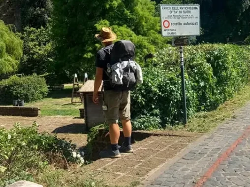 Posilnění a pokochaní jsme se vydali na výpadovku směr Vetralla. Chtěli jsme si někoho stopnout, protože cesta po silnici byla 10 km a nás by po svých čekalo 20 km. Zároveň jsme měli plán, cítili jsme, že s takovouhle do Říma prostě po svých ještě nedojdeme, že si to zkrátit chceme. Chvíli jsme tam stáli u vjezdu na benzinu, Michal dokonce napsal fixou na velký papír název městečka (to vše si nesl z domova), ale jako bychom byli neviditelní. Jeden okolojdoucí pán nám pak řekl, že za 2 minuty jede autobus, i ten nezastavil. No stáli jsme asi 10 m od zastávky. Nakonec asi pět minut na to jel další autobus, který nám zastavil a počkal, až k němu dojdeme. Zjistili jsme, že nemusíme do Vetralla, což by byl ušetřený jen 1 úsek a čekalo by nás ještě 1 další popojetí, ale že můžeme až do Sutri a tím ušetříme úseky dva (asi 50 km). Takže jsme se prodrali mezi studenty dozadu autobusu, ještě jedna paní za náma běžela a vzala si od nás lístky a štípla nám je vpředu a přinesla – to nás fakt nenapadlo, že si koupený lístek od řidiče musíme ještě štípnout 🤷🏻♀️ A frčeli jsme.