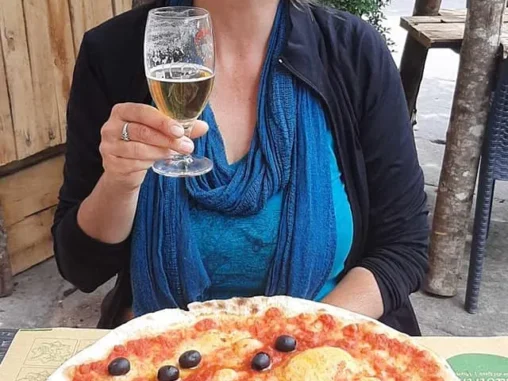 Čekalo nás Viterbo, velké město, které jsme slyšeli a viděli, nicméně cesta k němu měla ještě 7 km. Dlouho jsme šli podél města po nekonečné štěrkové cestě, míjeli bohužel zavřené termály a pak jsme konečně skrz podchod pod dálnicí, který vypadal jako brána do jiné dimenze, vstoupili do města. Nejdřív nás přivítaly obchoďáky, ale po nějaké době jsme se propracovali k centru, které zpočátku nebylo tak úchvatné, ale později nám odkrylo opět své překrásné uličky a všechnu tu nádheru. Dnes jsme byli vzorní a získali 3 razítka! Jelikož líná huba = holé neštěstí, tak v druhém informačním centru (po delší době dopoledne ve městě, tak obě byla otevřená) jsem se mimo razítka zeptala i na pizzu, kde bychom ji mohli dostat k obědu, nějakou dobrou (protože většinou otevírají až na večeři). Tak se nás pán ptal, zda chceme malou, velkou, tlustou, tenkou,… když jsme mu popsali své přání (a já je ještě zapomněla dodat, že bych ráda nějaké moc příjemné venkovní posezení), poslal nás na jedno maličké náměstíčko do Restaurante pizzerie Labyrint. A tam to bylo všechno! 🤩 I sympatická paní nám přidala ještě 1 stolek a 2 židle pro naše batohy a dali nám nabíjet mobily. Pizza byla opravdu vynikající, i malé pivo na doplnění minerálů proběhlo ☺️ A jako završení hned vedle vynikající obrovská zmrzlina 🍦