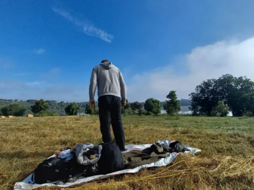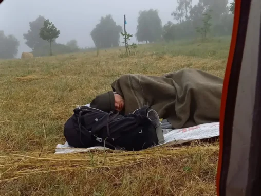 Ráno jsme se vzbudili do mlhy, přitom když jsem v noci byla čůrat, stan mi ozařoval úplněk 🌕 Spánek už nečekám extra dobrý, budím se a hledám polohy, kde by toho co nejméně bolelo. Naštěstí mlha se brzy zvedla a svět byl zase pozitivnější. My mohli vysušit vše potřebné, já si uvařila kaši a pomalu jsme zabalili a vyrazili. Ještě jsem se rozloučila s cyklo-poutníkem spícím nedaleko nás ve stanu, který se vrátil nedávno z ročního cestování po Vietnamu (dojel tam z Itálie na kole), pobyl 1 den doma a vyrazil na cyklo-putování (ne však do Říma) – to je opravdu obdivuhodné 🤩