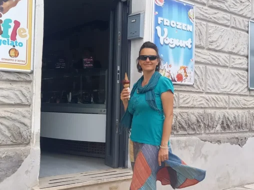 Když jsme odsud vyrazili, cesta nás vedla na zavřený most (měl nějaká polámaná prkýnka), ale my se nedali, přelezli zábranu a pak na konci mostu další a chvíli na to na židli na kraji políčka byl místní pán (jak kdyby tam čekal na zbloudilé poutníky) a říkal nám, že ten most je zavřený, že teda asi není cedule z druhé strany (njn, byla). Na to, že mu nerozumíme, nám dlouze italsky vysvětlil, kudy máme jít dál. Poděkovali jsme a šli 😀 A došli na místo, na které bychom se 3x rychleji dostali, kdybychom nelezli přes most. Pak nás cesta vedla na velký pkopec, abychom se pokochali výhledy a pak zase dolů… Později mě čekala vynikající zmrzlina v městečku Buoncovento (sladěná s tričkem). Ale hlavně krajina je tu prostě Boží 😍