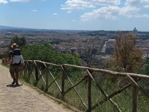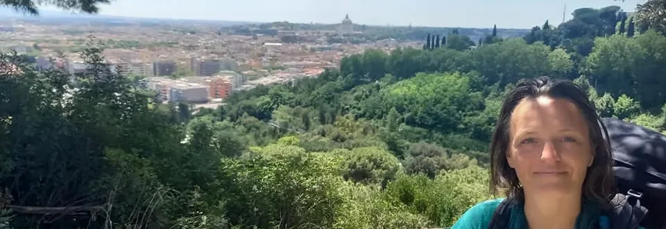 Ale abych to nezamluvila, cesta městem byla chvílemi v pohodě, když šlo jít stínem, protože bylo jasno a opravdu horko. Velká část naštěstí vedla další přírodní rezervací, která nám poskytla, mimo stín a příjemný terén, také nádherný výhled na Řím z vrchu 😍 Cesta dolů byla pak sice horší, ale stálo to za to! V jednom místě, na kraji parku, jsem si uvařila poslední porci čočkového dhalu a vykročili jsme nadšeně a natěšeně do finále!